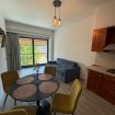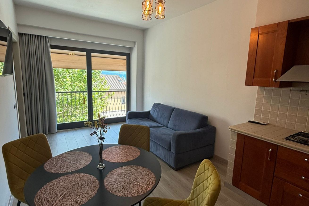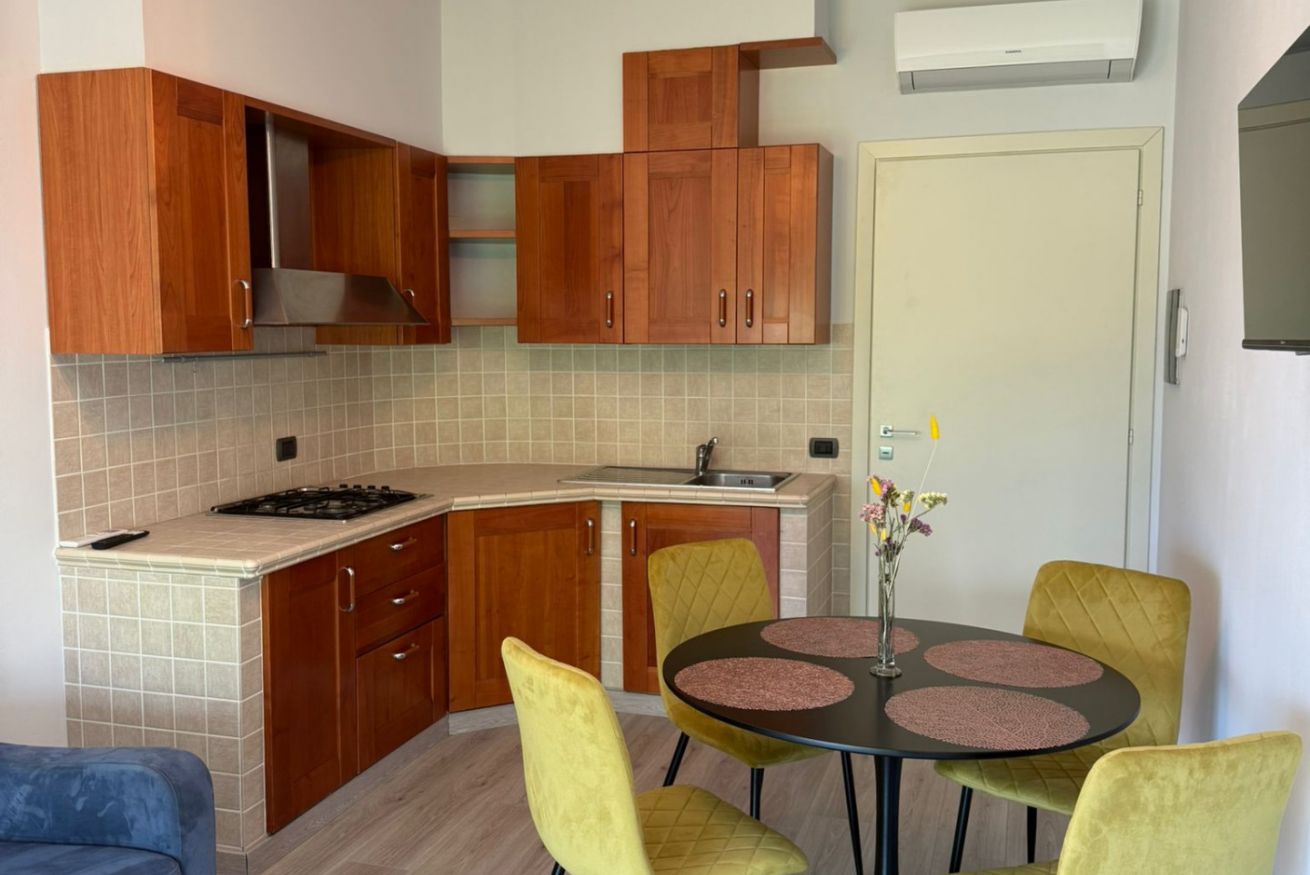 La zona giorno luminosa offre una cucina completamente attrezzata con balcone, tavolo da pranzo, divano letto e TV.