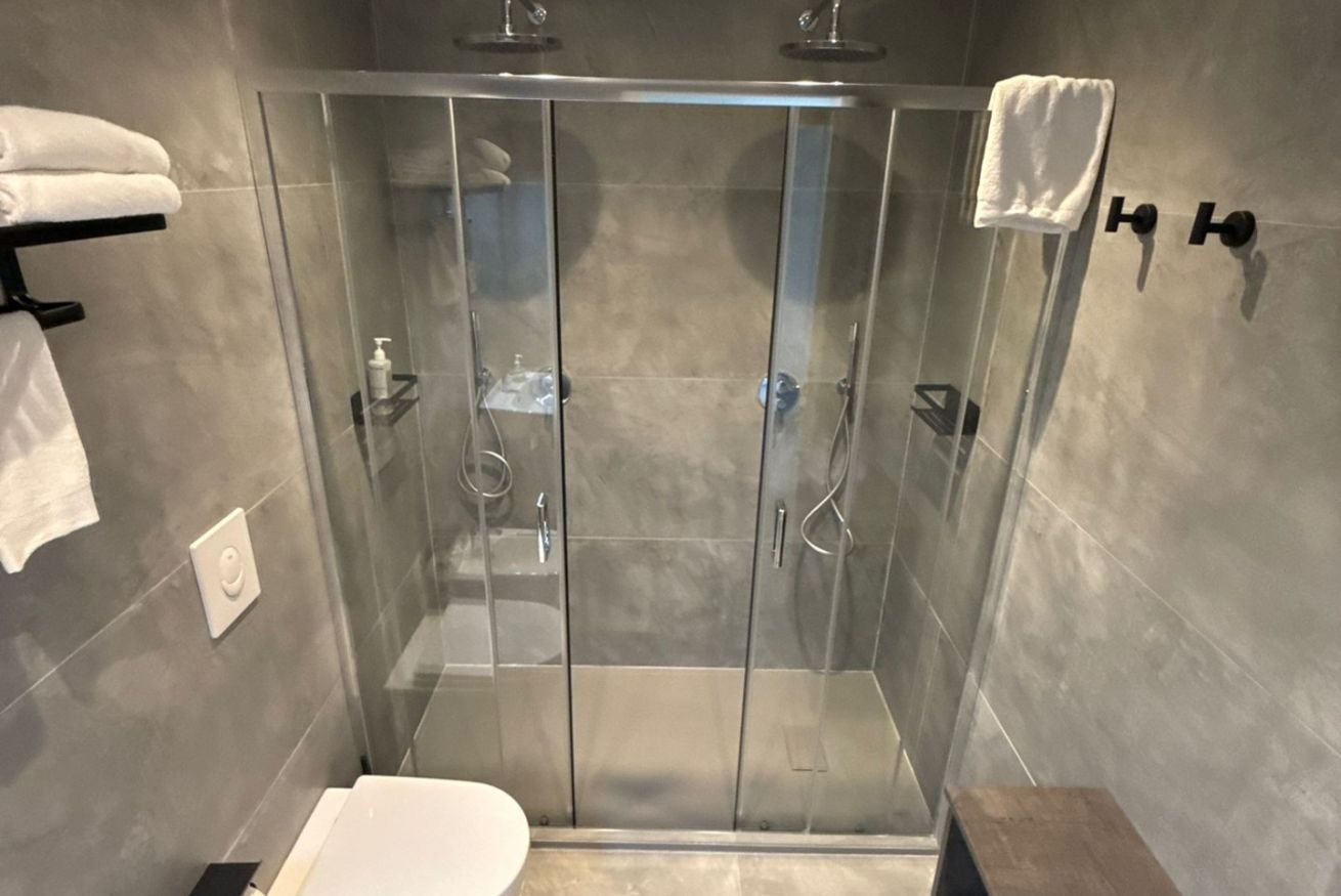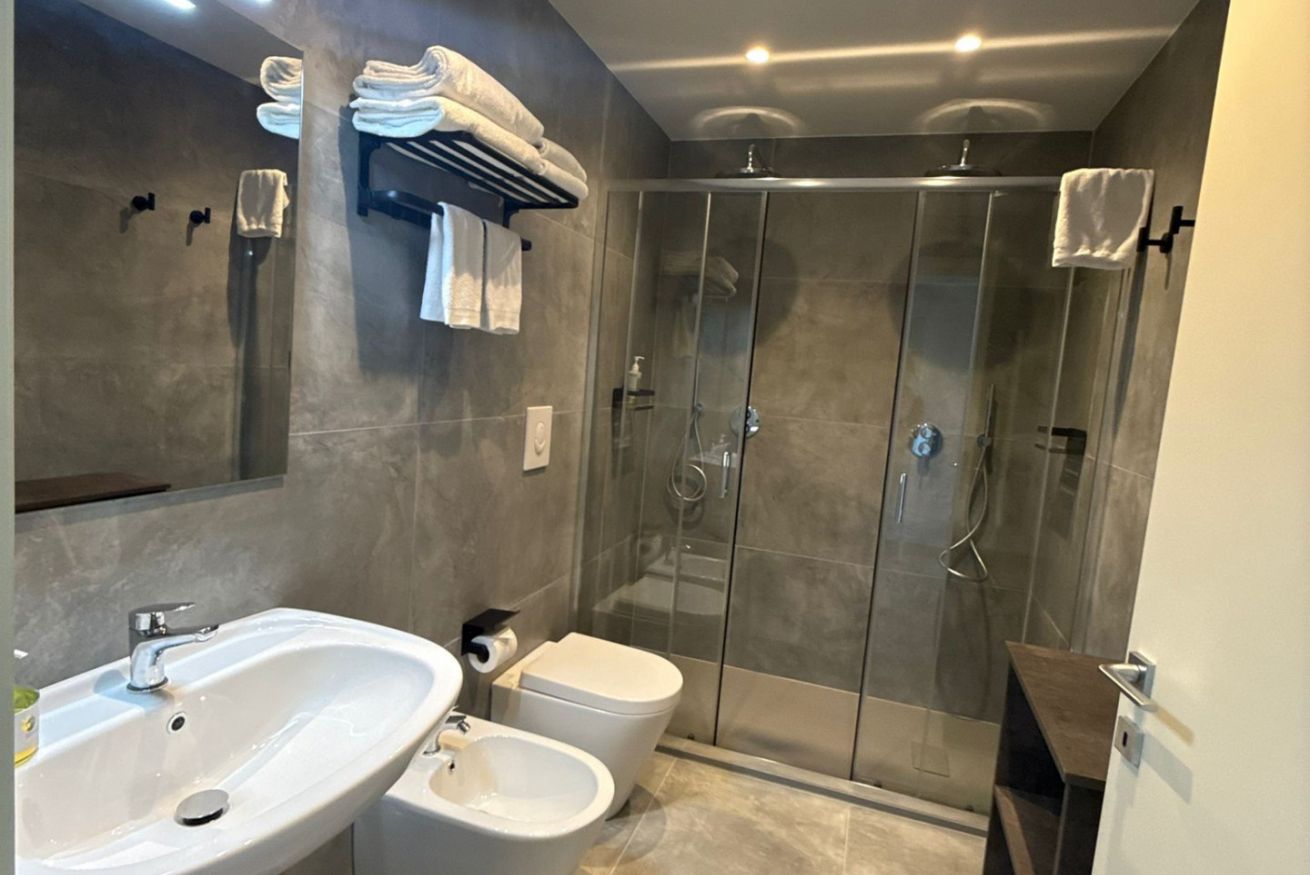 Il bagno moderno dispone di doppia doccia e di tutto il necessario, incluso un phon.