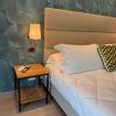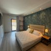 La camera matrimoniale è ampia, con parete decorativa elegante, seconda TV, cassaforte e accesso diretto al balcone.