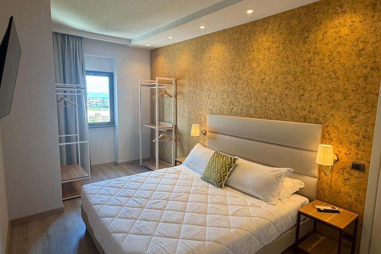 La camera matrimoniale, elegante e luminosa, è arredata con gusto e dotata di seconda TV e cassaforte, con accesso diretto a un secondo balconcino, perfetto per godere della brezza marina.